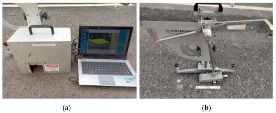 Field pavement data collection. (a) 3D texture data scanning; (b) road friction BPN measurement.
