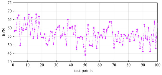 Figure 5 below shows the distribution of friction coefficient values at different test points, and it can be seen that most of the friction coefficient values are in the range of 45–70, which is in line with the required domain width for the study.