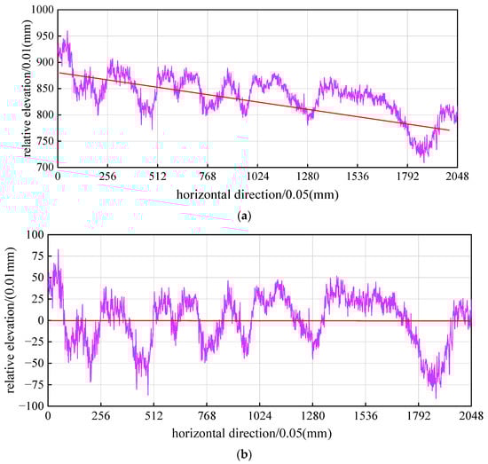 where b1 represents the elimination coefficient of inclination, b0 is the elimination coefficient of bias error, hi and Hi, respectively, represent the elevation value of collection point i corresponding to before and after correction, and N is the total number of collection points of a single scan line. By calculating the slope of each scan line and horizontally correcting it, the modified profile data are collected and are shown in Figure 6b.