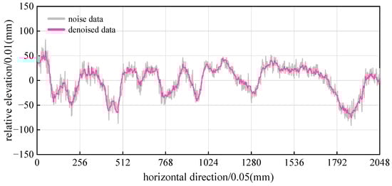 After processing the outliers, additional optimization for noise reduction is imperative. Noise, unlike outliers, typically blurs the signal contour, obscuring the genuine signal and complicating the identification of real information. To mitigate this influence, this paper employs discrete wavelet transform denoising, known for its robust noise reduction stability and mature application, to optimize the noise in the texture data. The processing results are visualized in Figure 7. Following data optimization for noise reduction, the 3D pavement surface was reconstructed, as illustrated in Figure 8. Notably, the reconstructed pavement features closely align with the original pavement texture features.