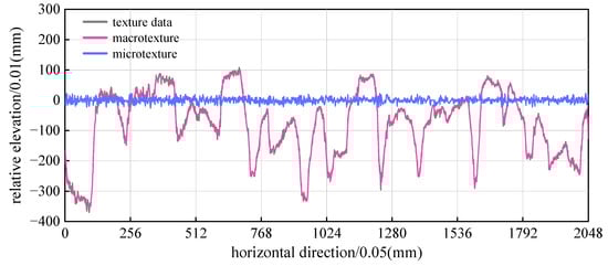 Texture can be categorized into four types based on wavelength, where the macro texture corresponds to the wavelength range from 0.5 mm to 50 mm, and anything below 0.5 mm is considered microtexture. Both macro- and microtextures influence the skid resistance of asphalt pavement, representing low-frequency and high-frequency information, respectively. The discrete Fourier transform (DFT) is a mathematical technique used to convert a discrete signal, such as a digital signal, into a frequency domain representation. It transforms a series of discrete time-domain samples into a frequency-domain representation that includes magnitude and phase information. The discrete Fourier transform is extensively employed in digital signal processing, communication systems, image processing, and other related fields. It aids in the analysis of a signal’s spectral properties, facilitating operations like filtering, frequency domain processing, and feature extraction. In this study, pavement data are transformed into frequency domain data through DFT. Subsequently, they undergo band-pass filtering using a Butterworth filter, yielding distinct macrotexture and microtexture information, as shown in Figure 9.