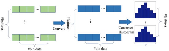 LightGBM adopts a histogram-based learning approach instead of preordering. This reduces memory consumption because there is no need to save the sorted feature index, while also speeding up the process of calculating segmentation points. The basic idea of the histogram algorithm is that when constructing the decision tree, it does not directly use the sorting information of the original data, but divides the value of each feature into several intervals, namely, the histogram columns (bins); as shown in Figure 10, below, the histogram algorithm is actually to convert the continuous floating-point features into discrete features. Then, we count the data and feature label distribution of samples in each interval. This discretization process makes it more efficient to find the best segmentation points. The first advantage of histogram learning is to reduce memory consumption: since there is no need to store the sorting index of the original data, only the histogram information is stored, reducing the memory overhead. The second is to speed up segmentation point calculation: histogram statistics make the calculation to find the best segmentation point more efficient, especially on large-scale datasets.