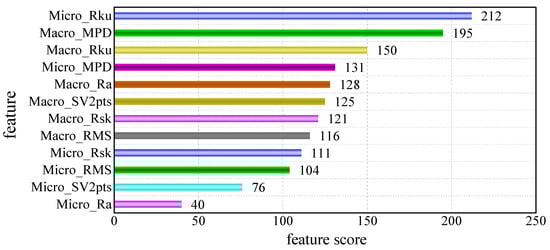 By applying this principle, we are able to determine the impact scores of each pavement texture feature on the pavement friction BPN, as shown in Figure 14. Among the traditional height parameters, Rku and MPD remain effective indicators for assessing skid resistance and have the highest scores in this model. Regarding the macro- and microtexture features, Micro_Rku holds the highest score, followed by Macro_MPD, which exhibits a substantial gap compared to the scores of other features. This indicates that Micro_Rku can effectively capture the micro-level changes in effective contact texture caused by vehicle wear over an extended period, while Macro_MPD can effectively capture the macroscopic changes in effective contact texture resulting from long-term vehicle wear. Additionally, there is a noticeable discrepancy in scores between Micro_Rku and Macro_Rku, highlighting the differing degrees of influence that macro- and microtextures exert on pavement skid resistance. This strongly supports the rationale and necessity of investigating the influence of macro- and microtextures on pavement skid resistance. Conversely, the remaining texture features did not demonstrate significant differences and had minimal impact on the model evaluation, likely due to the inclusion of extraneous texture information and the replacement of the effective component by other features.