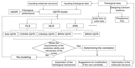 In the study of the QSTR, we are faced with another problem in that regression method (a statistical method) is adopted to establish the prediction model. At present, MLR, PLS, and ANN methods are adopted in QSTR modeling. Research on the quantitative relationship between the structure of lubricants and tribological properties is still in its infancy. Figure 1 illustrates the basic working idea, which is to conduct the computer-aided design of the molecular structure of the lubricant and predict the tribological properties of the molecules.