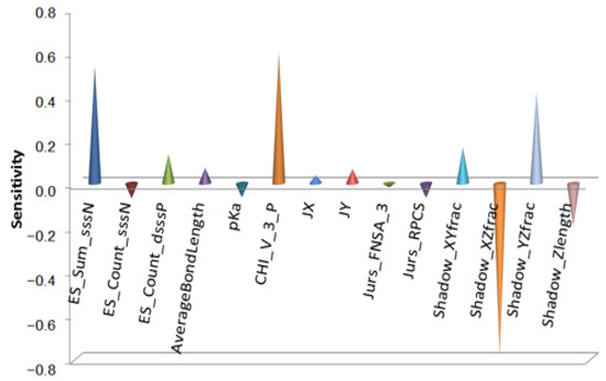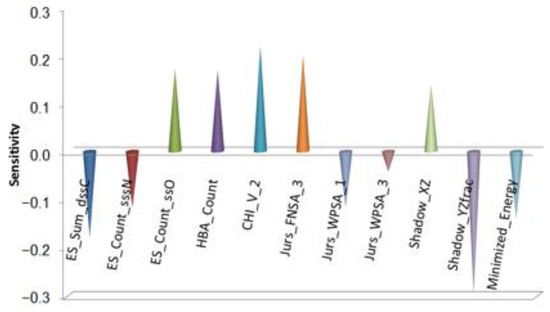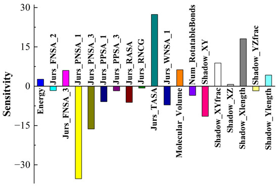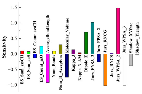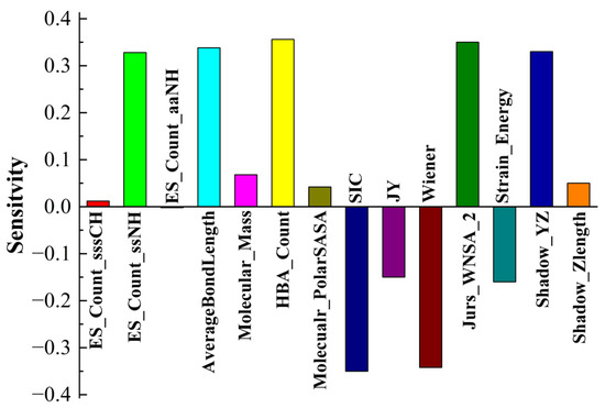 Tribological tests were carried out, where S-substituted molecules and template molecules were used as lubricant additives and TMT, DE, and TMPTO were used as base oils [38]. BPNN-QSTR modeling and descriptor sensitivity analysis were conducted with template molecules and substitute molecules as samples, as shown in Figure 6, Figure 7 and Figure 8. The rules for filtering QSTR descriptors are based on their levels of importance. The model selects the most important descriptors and removes those that are less important until selecting or removing more descriptors does not improve the model further. During the modeling, structural descriptors related to sulfur are introduced and filtered. However, almost all sulfur-related structural descriptors were subsequently removed. The only exception is sulfur-related ES_Sum_aaS in the TMPTO model, but its contribution to the antiwear performance is small. The modeling thus shows that the contribution of sulfur to the antiwear performance is small, which confirms that the substitution of sulfur in additive molecules is reasonable and feasible.