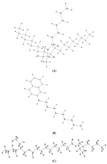 Exploring further properties such as energy, dipole moments, polarizability, and more, semi-empirical methods such as DFT methodology were used, substituted by PM3 methodology. Density Functional Theory (DFT) expresses all properties of a given molecule by the calculation of the charge density calculated by the square of the wave function. DFT calculation gives superior results in exploring spectral data and molecular geometries. In the case of large and complex structures, a DFT calculation may be time-consuming. We changed our methodology to the less accurate but fast-computing Parametrized Method 3 (PM3). Pre-studies not presented here have shown a good correlation between the two methods. The choice for PM3 was then taken due to the ease of computation. A detailed description of the methodology is not the intention of this paper which refers the reader to the basics of quantum chemistry. Parametrized Method 3 exploration was applied so that the molecule was again converged to its energy minimum defined by an RMS 0.01. The numerical values of the sketched molecules could then be read out, e.g., energy, dipole moment, inducible dipole moment, and more. The dipole moment is calculated in the units Debye (D). Figure 1 shows an example of the computational routine: