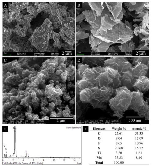 The structure and composition of bulk MAX phase precursor, MXene sheets and the synthesized hybrid MoS2-Ti3C2 were characterized by SEM and EDX, as shown in Figure 1. From Figure 1A, the microstructure of bulk MAX phase precursor Ti3AlC2 shows solid and stacked multilayer nanosheets, while Figure 1B shows the SEM image of Ti3AlC2 after etching and exfoliation with HCl-LiF via microwave-assisted hydrothermal synthesis. The MXene sheets in Figure 1B showed crumpled structures with thinner and few layered structures, indicating the successful formation of thin layers of 2D MXene nanosheets by excluding Al element from packed MAX layers during the etching and exfoliation process. Additionally, it can be seen in Figure 1C,D that the hybrid MoS2-Ti3C2 was properly formed where MoS2 and a densely aligned enclosed surface of Ti3C2 MXene. The MoS2 nanoparticles were uniformly distributed, well faceted, densely grown, semi-vertically and interleaving lamellar nanosheets with rough edges, which ascertains the nanosheet morphology of MoS2. The edge-oriented structure of MoS2 is highly desirable to expose more active sites to enhance tribological behaviour [22]. The EDX spectrum and elemental mapping are shown in Figure 1E,F, ascertaining the existence of sulphur, molybdenum and titanium and the successful formation of hybrid MoS2-Ti3C2 via microwave-assisted hydrothermal synthesis method.