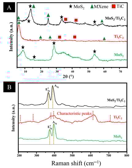 (A) XRD spectrum and (B) Raman analysis of MoS2, Ti3C2 and MoS2-Ti3C2.