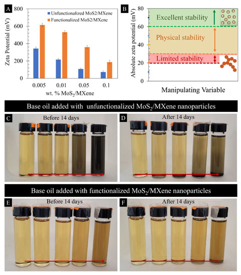 (A) Zeta potential of unfunctionalized and functionalized MoS2-Ti3C2-based nanolubricant (B) Schematic representation illustrating stability and zeta potential ranges (C,D) Visual observation of unfunctionalized MoS2-Ti3C2-based nanolubricant before and after 14 days (E,F) Visual observation of functionalized MoS2-Ti3C2-based nanolubricant before and after 14 days.