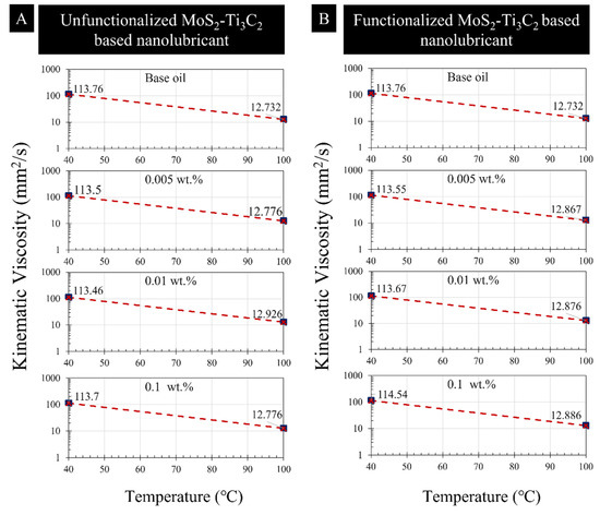 Variation of kinematic viscosity with temperature for (A) unfunctionalized and (B) functionalized MoS2-Ti3C2-based nanolubricant.