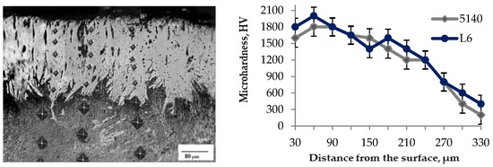 The maximum microhardness (about 1800 HV) of the 5140 steel sample is lower compared to the L6 steel sample. The hardness gradually decreases from the surface to the base metal without significant fluctuations until it reaches a plateau with a hardness of the 200–300 HV (Figure 3).