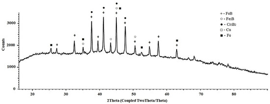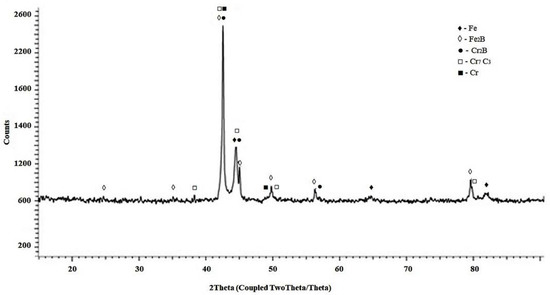 XRD analysis of L6 steel showed that the diffusion layer consists of three borides: FeB, Fe2B, and Cr5B3 (Figure 4). It is known that copper does not form stable compounds with either boron or iron [24,25]. Copper was found on the surface of the L6 steel. The presence of two borides, Fe2B and Cr2B, was revealed in the diffusion layer of 5140 steel (Figure 5). In addition, one carbide Cr7C3 was identified. A higher amount of chromium led to the formation of the observed presence of chromium in its pure form. It should be noted that the presence of higher FeB boride is not observed, which is due to the fact that chromium retards diffusion of boron into the base metal [26].