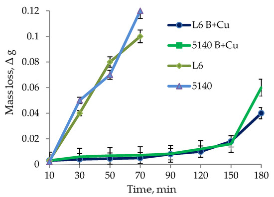 The wear test indicated that the samples after the TCT outperformed samples without treatment by several times (Figure 6). Both steels had a similar mass loss rate in the bare state which is characterized by a dramatic loss of mass from the very beginning of the test. After the TCT, both steels demonstrated sustained wear resistance up to 90 min testing. Between 90 and 150 min of testing, mass loss slightly increased from 0.008 to 0.015 g. After 150 min of testing, a significant mass loss was found for both steels, indicating that the diffusion layer had failed. Further tests indicated a differentiation slope of the mass loss depending on the steel grade. Due to the higher concentration of alloying elements and better mechanical characterization of L6 steel, its mass loss was lower compared to 5140 steel. The slope angle in the last stage of testing characterizes a complete wear of the diffusion layer and achieves the base metal.