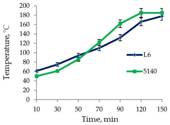 The wear process was accompanied by removing micro asperities and separation of small particles, which, in turn, acquired the simulated nature of abrasive wear. Finally, the particles were removed from the interaction zone, which led to an increase in the contact area. As a result, the heat generated by friction was provoked [31]. A direct correlation between the wear test duration and the temperature in contact zone was shown in Figure 7. The maximum temperature values for L6 and 5140 steels were measured as 178 °C, and 185 °C, respectively. It should be noted that the temperature reached a maximum after 120 min of testing for 5140 steel, while for L6 steel, it continued to rise until the end of the test.
