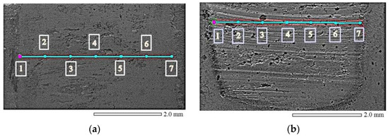It is known that friction-induced heating accelerates tribooxides formation [32]. The EDS analysis of the worn surface on L6 steel showed that all seven spectra across the worn track contain oxygen confirming surface oxidation (Figure 8a, Table 2). As for the diffusion elements, boron content was up to 0.85%, and copper was up to 34.11%. High concentrations of copper, nickel, chromium, iron, and aluminum can be explained by the creation of oxide film on the worn surface. The latter element was in the treatment powder as a balancing medium. The high carbon content can be explained by contamination during the test. The surface of 5140 steel was also highly oxidized after the wear test (Figure 8b, Table 3).