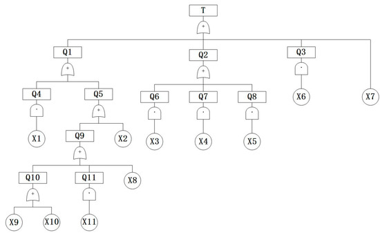 The minimum cut set of the high-viscosity marine engine oil fault tree established from Figure 1 is {X1}, {X2}, {X3}, {X4}, {X5}, {X6}, {X7}, {X8}, {X9}, {X10}, {X11}.