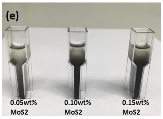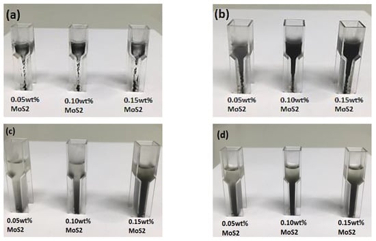 Visual observations of the test samples were carried out over 25 days. The samples were well-sonicated before observing the occurrence of the sedimentation process. Figure 1 shows the samples of sedimentation of various nanofluid concentrations after four weeks of observation. Figure 1a shows that the sedimentation of nanoparticles is significant, where nanoparticles and base oils started to separate into two complete layers, indicating that the nanoparticles are dispersed poorly in this combination of base oil concentration [26]. In the samples from Figure 1b, no pristine nanoparticles were observed in the base oils. It could be said that the nanoparticles are relatively well dispersed and have high suspension stability [27]. It can be seen in Figure 1c–e that the nanoparticles are gradually sedimenting to the bottom of the cuvettes, forming relatively clear base oil solution layers at the top.