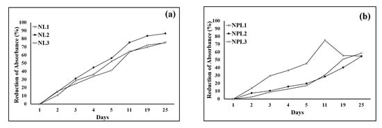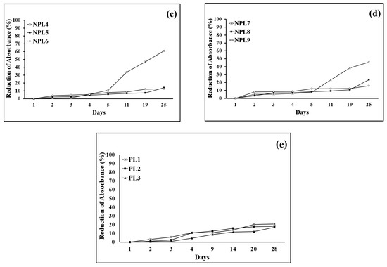 Percentage of absorbance reduction for various concentrations of MoS2 with respect to time. (a) NL1-3, (b) NPL1-3, (c) NPL4-6, (d) NPL7-9, (e)PL1-3.