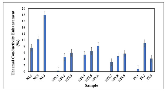 Figure 3 shows the percentage thermal conductivity enhancement of the MoS2 nanolubricant at 40 °C. Based on Figure 3, it can be seen that the higher the concentration of MoS2, the more conducive it is in enhancing the thermal conductivity of the nanolubricant. This trend could be well explained by the Brownian motion, where the nanoparticles tend to collide with each other more frequently at higher concentrations due to the kinetic energy possessed by the elevated temperature [28]. However, the results portrayed in Figure 3 (PL1-3) did not follow the trend mentioned earlier. This was due to the natural behavior of the peanut oil, where the nanoparticles could not be completely mixed in the peanut oil as compared to naphthalene oil. Additionally, it was noticed that the higher concentration of MoS2 contributed to a better thermal conductivity enhancement.