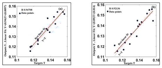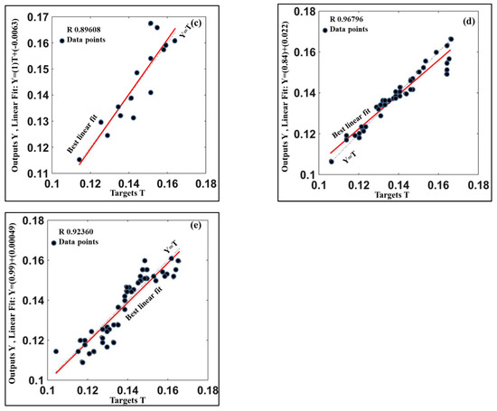Scatter plots of ANN models for highest R value: (a) 25 °C; (b) 40 °C; (c) 55 °C; (d) graphene MoS2 at 24 °C; (d) graphene MoS2 at 40 °C; (e) graphene MoS2 at 55 °C.