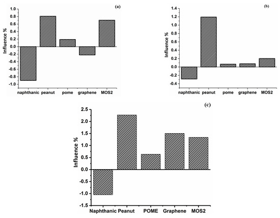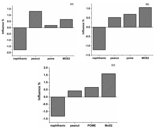 Figure 5 shows the sensitivity analysis of the thermal conductivity at various temperatures. In the case of models which are derived from data, it is important to determine the influential parameters affecting the outputs. However, due to the complex hidden relationships in artificial neural networks, it is not easy to determine the relative importance of the parameters. However, this is made possible using sensitivity analysis. There are several methods of sensitivity analysis; here, the connection weight method was chosen [29,30]. It can be seen that naphthenic oil content exhibits a negative trend at all temperatures, which means the higher the content of naphthenic oil, the lower the thermal conductivity will be. However, the other factors, such as peanut, POME, and MoS2, have a positive Influence, i.e., the higher the content of peanut oil, POME, and MoS2, the higher the thermal conductivity will be. At 25 °C, the peanut oil seems to be more influential than POME and MoS2 (Figure 5a). At 40 °C and 55 °C, MoS2 appears to have a more significant effect than peanut oil and POME. At each temperature, thermal conductivity increases with increasing MoS2 concentration (Figure 5b,c).