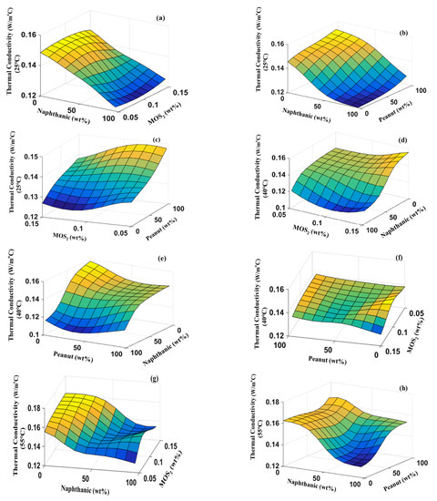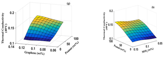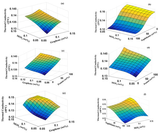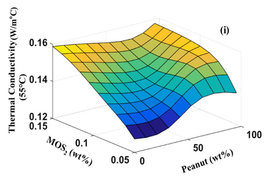 As seen in Figure 8a-d, the thermal conductivity also increases with increasing concentrations of MoS2, graphene, and peanut oil. It can further be seen that MoS2 and graphene, when combined, do not affect thermal conductivity after a particular concentration. In this case, no profound effect was observed after MoS2, and graphene concentration was 0.1 wt% (Figure 8a). Similar to Figure 7, naphthenic oil seems to deteriorate the thermal conductivity (Figure 8b). The situation with graphene and peanut oil is similar (Figure 8c). A combination of higher concentrations of graphene–peanut oil and MoS2–peanut oil enhances the thermal conductivity, as seen in Figure 8c,d. The interactions at 40 °C and 55 °C, as seen from Figure 8e–i, exhibit similar patterns as those observed at 25 °C, where naphthenic oil decreases the thermal conductivity and peanut oil, graphene, and MoS2 enhance the thermal conductivity. Thus, it can be seen that the interaction of naphthenic oil and graphene–MoS2 nanoparticle content showed an enhancement in thermal conductivity.
