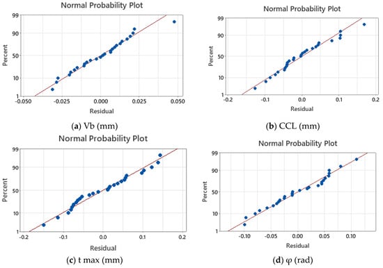 As shown in Figure 6, normal probability charts of the output response data have been plotted. A normal probability chart is a popular graphical representation of the normal distribution of data. If the data points roughly form the straight line, then one can suggest that data is normally distributed. The normality of the data, as observed in this case, exhibits that it can be processed with statistical techniques in order to obtain reliable results.