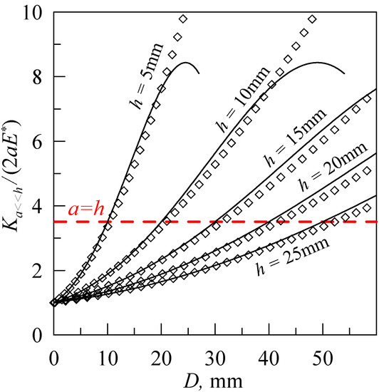 As follows from Figure 2, the magnitude of Ka<<h/2aE* decreases when the layer thickness h grows. In the limit case of infinite thickness , the solution is reduced to the half-space approximation Ka<<h/2aE* = 1 when the contact stiffness does not depend on the indenter diameter. As it was mentioned in the Introduction, if the thickness of the indented substrate exceeds the diameter of the indenter, the substrate can be considered a half-space. However, Figure 2 shows that in real contact, the half-space approximation is valid only for very large ratios h/D. For h = D = 5 mm, the stiffness ratio Ka<<h/2aE* ≈ 1.9 is almost 2, meaning that the contact stiffness is almost twice the half-space approximation. Curve h = 5 mm reaches magnitude Ka<<h/2aE* = 1.2 at D ≈ 1.55 mm. Therefore, half-space approximation leads to an error of 20% when h/D = 5/1.55 = 3.22, i.e., when the thickness of an elastomer exceeds the diameter of an indenter by more than three times. The restrictions of the half-space approximation were discussed in detail in our recent study [28].