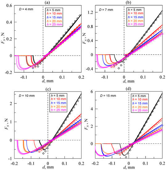Figure 3 shows dependencies of the normal force FN on the indentation depth d, obtained through the indentation of the cylinders with a flat base of diameter D = 4, 7, 10 and 15 mm into layers of rubber TARNAC CRG N3005 of different thickness h. Each panel of the figure shows five dependencies corresponding to the different magnitudes of the layer thickness: h = 5, 10, 15, 20 and 25 mm. Solid lines are experimental results, while the results of the computer simulations are shown with symbols. Every dependence measured in an experiment at constant D and h consists of three curves obtained in three consecutive cycles of indentation. For all measurements, these curves visually overlap. Note that in all experiments, the velocity of indenter motion was equal to 1 µm/s in both directions. With this indenter velocity, the contact can be considered quasi-static and the viscoelasticity can be neglected [29].