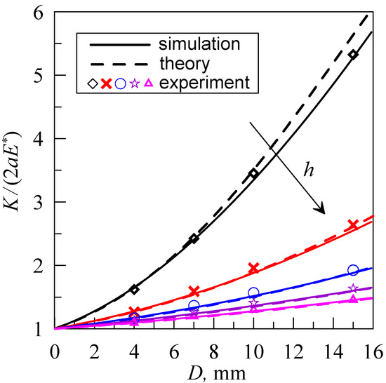 As mentioned above (see description of Figure 2), even at magnitude h/D = 3.22, application of half-space approximation leads to a contact stiffness reduction of 20%. Thus, all dependencies shown in Figure 3d are not within the range of application of half-space approximation. For more detailed analysis, magnitudes of contact stiffness K = dFN/dd were estimated from the experimental dependencies FN(d) shown in Figure 3. Estimated values are plotted as symbols in Figure 4. Figure 4 also shows the contact stiffness calculated through the BEM simulations (solid lines) and theoretical approximation (5) (dashed lines).