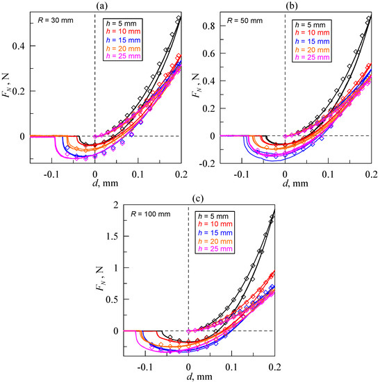In the experiment, during the indentation phase, adhesive interaction between the surfaces is weaker compared to that in the pull-off phase. This well-known fact leads to secondary adhesive hysteresis and corresponding differences in FN(d) dependencies measured during indentation and pull-off [30,31,32]. Such behavior can be described by introducing two different magnitudes of the adhesion specific work Δγ for both phases, respectively, where Δγ1 related to pull-off is significantly larger than Δγ0 related to indentation. We found that the contact of the steel indenters with elastomer TARNAC CRG N3005 is characterized by the empirically estimated value of Δγ0 = 0.0175 J/m2 for indentation phase and a range of values Δγ1 from about 0.3 to 1 J/m2 for pull-off [33]. It is worth noting that larger-value Δγ1 can be reached by chemical treatment of the indenter. For instance, in ref. [33], after short-time treatment of the surface of steel indenter with 40% water solution of FeCl3, magnitudes of Δγ1 up to 13 J/m2 were observed. Notably, even though chemical treatment significantly increases Δγ1, it has almost no effect on Δγ0 (which is related to contact propagation). Dependencies plotted using symbols in Figure 3 show the results of BEM computer simulations related to the pull off of the indenter starting from maximal indentation depth d = 0.2 mm. All simulations were performed with the same values of elastic and adhesive parameters: E = 0.324 MPa, ν = 0.48, Δγ1 = 0.326 J/m2. Magnitudes of elastomer layer thickness h in simulations were chosen to be the same as in the experiments. In the simulations, an elastic layer was located at the half-space substrate with elastic modulus equal to E2 = 10100 Pa. Such an extremely large value ensures absolute rigidity of the substrate in simulations. At the same time, in the experiment, rubber layers were placed on the 8 mm thick silicate glass substrate with an elastic modulus exceeding that of rubber by five orders of magnitude. This glass substrate was fixed on the aluminum table as it is shown in Figure 1b.