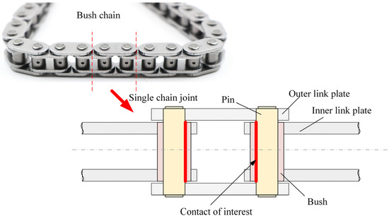 A bush chain consists of several individual chain link joints, whose core elements are the bush and the chain pin. The bush is pressed into the inner link plates, and the pin is pressed into the outer link plates. In Figure 1, a picture of several bush chain links, as well as a schematic depiction of the subcomponents in assembled condition, are shown. In the chain joint itself, the contact between the pin and bush is tribologically loaded through load transmission and the change of direction using the normal load and the relative motion between the pin and bush. This contact is generally considered one of the major friction losses in a bush timing chain [5].