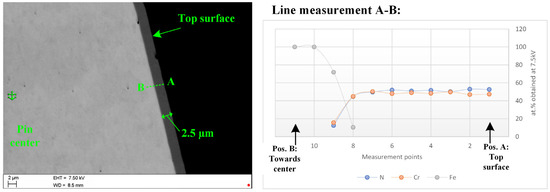 In the microsection of a pin, see the scanning electron microscope (SEM) picture in Figure 3—taken with a ZEISS EVO 15 from Carl Zeiss GmbH(Wien, Austria)—it can be seen that the pin consists of a substrate material, on which a thin coating of 2.5 µm thickness has been applied. An elemental measurement in the microsection using energy dispersive X-ray spectroscopy (EDS or EDX) from Oxford Instruments GmbH(Wiesbaden, Germany)—see line measurement A-B in the microsection—identified the substrate material as an iron-based material (Fe amount) and the coating as a CrN monolayer, which in the literature is generally attributed with good tribological properties [14,15,16,17]. It can be clearly seen that the elemental composition of the iron-based spectrum changed to a 1:1 ratio of Cr and N.