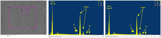 In contrast to the pin, the bush is made of an uncoated steel, as the analyses in Figure 4 show. EDX measurements confirmed the presence of several alloying elements in addition to iron, such as Cr, Ni, Si, and Mn (see both element spectra in Figure 4). The surfaces of the bushes were quite smooth, which was deduced from the optical appearance, but even more so from the roughness measurements with an Alicona InfiniteFocus IFM G4 optical roughness meter from Alicona Imaging GmbH (Raaba, Austria). The roughness measurements on this device were carried out in the form of line measurements according to the ISO 4287 standard and resulted in Ra values around 0.056 µm and Rq values around 0.072 µm.