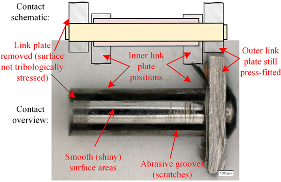 Based on the studies of the initial condition, a damage analysis of engine components that had been in operation provided further information, in which the tribological mechanisms had to be mimicked by a proper model testing technique. In this context, parts with higher wear were examined from the representative engine application, namely a timing chain of a diesel three-cylinder engine. The verification of the wear situation was performed via the measured values from the chain elongation measurements of individual joints before and after engine operation. In this regard, higher wear was defined as individual joint wear above 30 µm. The chains were dissembled carefully, in order to not damage the running surfaces of interest.