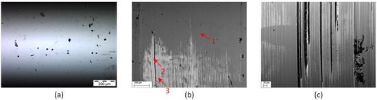 Detailed pictures of the pin surface phenomena are shown in Figure 6. These are light microscopic and scanning electron microscopic images of certain areas from the overview picture of Figure 5, which it should be emphasized again, can be considered a representative pin condition after an engine test run, where significant chain link wear was generated. In the central areas (Figure 6a), extremely mirror-smooth areas without noticeable sliding grooves can be seen. The holes, which also existed in the initial condition, appeared dark due to the extreme contrast difference with the smooth surface, which had a high backscattering of incident light. In these regions, hardly any traces of deposited products or tribofilm layers were found. Figure 6b shows an off-center area with many grooves and a large area of wear. The exposure of the Fe substrate can be clearly seen in the material contrast of the scanning electron microscope image. This is evident due to the different shades of grey, with lighter areas representing more heavy elements. By means of EDX element measurements, it could be confirmed that in these areas the Fe substrate had been exposed and the CrN layer was obviously worn (Figure 6b, Table 2, Spectrum 2, 3), which showed an advanced state of wear. In some other areas on the pin (see Figure 6c), very deep sliding grooves were seen and, in some cases, break-outs from the coating. Particularly deep grooves or break-outs were also repeatedly filled with lubricant residues. Other pin surfaces of parts with increased single chain link wear showed similar surface conditions; thus, the previously discussed phenomena can be classified as representative.