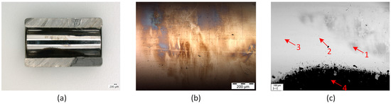 Bush surface and damage analysis after an engine test run: (a) Overview picture of the high loaded side; (b) LIMI picture of the center area, showing discolorations and smoothed surfaces; (c) SEM material contrast picture of the center area.