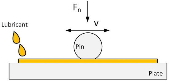 Based on the damage mechanisms found in the analysis of engine parts, there was a necessity to develop a simple model test at laboratory scale, which would facilitate investigations of tribological fundamentals relating to pin wear in isolation from their application (e.g., dynamic forces, etc.). In addition, damage equivalence between the application and model testing was a decisive criterion. Hence, the test configuration aimed to characterize wear phenomena and tribological processes for the tribological contact of a timing chain contact between pin and bush, assuming some test simplifications but retaining the damage equivalency as far as possible. A reciprocating pin-on-plate approach was chosen as the testing technique, as the special focus was on the evaluation of pin wear. In this test configuration, which is depicted schematically in Figure 8, the pin slides reciprocatively on a plate mating body, which represents the unwound bush under a defined normal load Fn. Oil supply is realized drop-wise through a small needle. In this context, the pins were used in their original condition, whereas for the unwound bush surfaces, model steel plates with similar surface topography and hardness values to the application were manufactured.