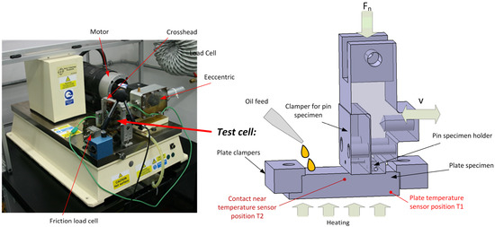 The test setup was implemented on a linear tribometer TE77 from Phoenix Tribology Ltd. (Kingsclere, UK), which has been used for many linear reciprocating tribological investigations, such as piston ring/cylinder liner studies, pin-on-plate basic studies for polymer based systems, etc. [27,28,29]. The TE 77 linear tribometer and a computer-aided design (CAD) representation of the test cell with the adapters designed to mount the chain pins and the mating plates are shown in Figure 9. The rotating movement of the shaft of the direct current motor was converted into a translatory movement through a double eccentric. The manufactured specimen holder for the chain pin was screwed onto a rod connected to the double eccentric, into which the chain rivet was clamped in a horizontal position. The force was introduced into the tribological system via a crosshead and the horizontal rivet was pressed onto the counter body, namely the mating plate, which represents the unwound bush. A roller enclosed in the pin specimen holder allowed the translatory movement of the adapter, with simultaneous introduction of the normal load Fn. The plate was fixed in an oil bath, which was heated by heating elements. The control of the heating power was performed through the plate temperature T1 signal. On the side opposite the double eccentric, oil was supplied to the tribological contact from a reservoir by means of a pump. The oil bath was supported by solid-state joints and thus enabled the measurement of the friction force FR with a piezoelectric sensor. The measured variables were the friction force or the friction coefficient μ (COF), the contact near temperature T2, and an electrical resistance measurement of the contact, namely contact potential (CP). In this regard, for the latter, a millivolt potential was applied to the contact and the resulting voltage signal across the contact indicated the contact condition, where 50 mV means isolating conditions through non-conductive layers, such as coatings, oxides, or boundary layers, and lower levels of CP signal indicate break-down thereof, which is commonly related to wear processes.