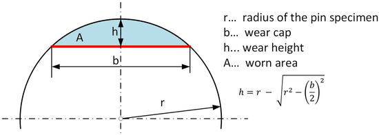As defined in the methodology chapter, a quantitative assessment of the wear could be made via the measurable width of the wear cap on the pin. From this parameter, the wear volume and the linear wear height could then be derived via the geometric relationship through the cylinder shape. Based on other recorded measurement parameters such as frictional values, the results were further evaluated and discussed in accordance with well-known and accepted friction and wear evaluation concepts, such as those of Archard [30] and Fleischer [31]. Thus, proven characteristic values for classifying the preceding tribological phenomena were derived and can made available to the reader.