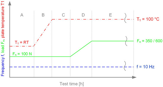 The tests were carried out according to the test procedure shown in Figure 11, with the marked phases A to E. At the beginning, phase A, the system was loaded with only 100 N and then accelerated to a test frequency of 10 Hz (with a 25 mm stroke). The system was not heated, and the oil flow was set to the constant of 1.58 mL/min. This phase lasted 600 s and enabled a moderate run-in. In phase B, the system was heated from room temperature to the desired test temperature within 450 s, namely a 100 °C plate temperature. In the following phase C, the control parameters were kept constant again for 450 s, which allowed thermal inertia effects to be compensated for. Phase D represents the load increase, in which the desired test load was applied within 900 s from the run-in load of 100 N.