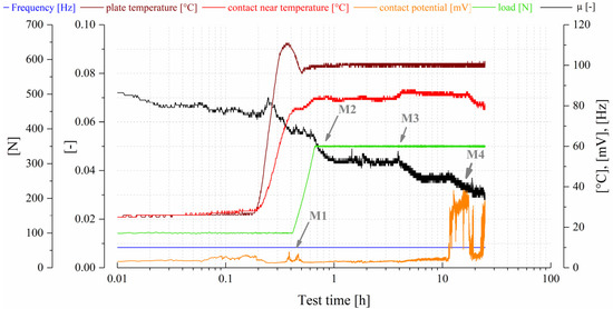 Figure 12 shows a test with a 350 N standard test load, which was determined by deriving representative motor characteristics from the automotive sector and applying them to the contraform contact situation of the test method used. The test time was 25 h. This test sequence is referred to as test category 1–TC 1. During the heating and loading phase, to test the temperature and test load, a run-in period was established. This was expressed in a decreasing coefficient of friction, which was associated with initial surface adjustments, boundary layer formation, and the viscosity change of the lubricant (see marking M2 in Figure 12). Under these conditions, the contact potential signal showed slight spikes (M1), but remained at a low level below 10 mV, suggesting slight run-in wear. When reaching the constant test conditions, the reduction of the coefficient of friction stops, but slight fluctuations in the coefficient of friction and peaks in the coefficient of friction were observed. The contact potential remained at a constant low level. After the friction peaks appeared, the contact temperature increased slightly. With a certain delay, a slight reduction in the coefficient of friction could also be seen (after M3). Afterwards, a stable state of equilibrium was reached. As the test progressed, the contact potential began to build up significantly, which also indicated insulating boundary layers (M4). Around 19 h of testing, small peaks in the friction value were again seen, which were heralded by the temporary collapse of the contact potential, before re-stabilization occurred towards the end of the test, accompanied by a slight drop in the contact temperature.