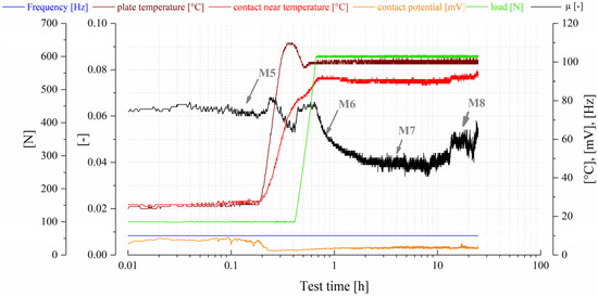 Figure 13 shows a test result with an increased test load (600 N) but otherwise the same test conditions, which is referred to as test category 2 (TC 2) in the remainder of this paper. In comparison with the TC 1 tests, several changes in the performance were observed. Similarly, at the beginning of the test, a run-in phase occurred, due to the increase in heating and loading (M5 and M6). This means that the friction coefficient dropped significantly before reaching a stable level (M7), whereby an increase in friction could also be seen in the intermediary during the heating phase (between M5 and M6). The contact potential also dropped to a minimum and remained at this level. After approximately 13 h of testing under stable conditions, but with a slightly unstable friction coefficient with recurring but minimal friction coefficient peaks and a low contact potential signal, a system change occurred that lasted until the end of the test. The friction value gradually increased and became increasingly unstable (M8). This increase in the friction value was also reflected in the contact temperature, which increased slightly. At the same time, a slight change was also seen in the CP curve.