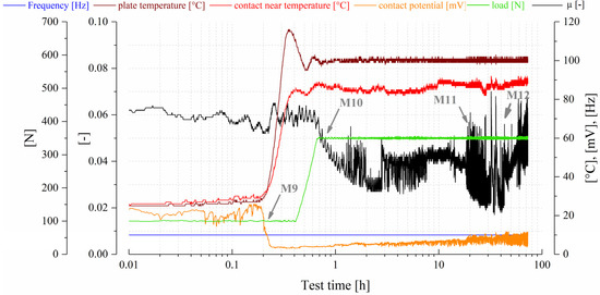 A test with moderate test load but longer testing duration of 73 h, which is referred to as test category (TC 3), is shown in Figure 14. At the beginning of the test, a phenomenologically comparable trend to the test in Figure 12 was seen, namely a decreasing coefficient of friction with slight fluctuations, a second longer-lasting but less pronounced decrease of the COF (M10), and a similar contact temperature measurement and low contact potential after heating the test (M9). Only the temporary build-up of the contact potential was not observed in this case. After about 20 h, there were again friction value peaks, which occurred regularly and then stabilized somewhat (M11). After 30 h of testing, there were stronger friction value peaks, which were subsequently replaced by a sustained increase in the friction value trend (M12). Due to the obvious wear processes going on, the contact potential could not build up over the entire test period.