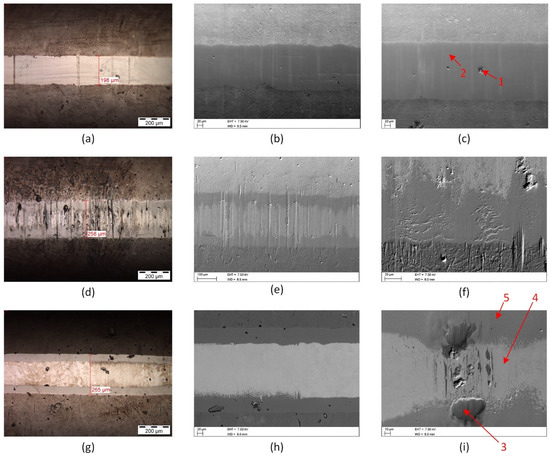 Surface analysis of chain pins: (a) LIMI picture after testing with TC 1; (b,c) SEM pictures after testing with TC 1; (d) LIMI picture after testing with TC 2; (e,f) SEM pictures after testing with TC 2; (g) LIMI picture after testing with TC 3; (h,i) SEM picture after testing with TC 3.