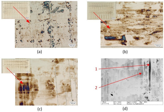 Figure 15 shows several light and scanning electron microscope images of the contact surfaces of chain pins from the tribological tests that were carried out. In case of moderate loading and a short test duration (Figure 15a–c), a distinct running track, which had a width of approximately 200 µm, was found on the pin. Within the track, it can be seen that the surface became smoother when compared with the initial state, similarly to what was seen on the engine components. This is evident in the light microscopy picture (Figure 15a), as well as in the scanning electron image shown in Figure 15b. An element point analysis at certain positions on the running track, marked in Figure 15c, proved that the CrN coating was still completely present and generally had not been rubbed through to the Fe substrate within the wear track (Figure 15c, Table 5, Spectrum 2). Locally, some slight abrasive grooves or local break-outs (Figure 15a or Figure 15c, Table 5, Spectrum 1) were seen on the running track, but there was no massive coating loss, deformations, or severe damage processes. Traces of lubricant additive elements or deposit products were only found in very localized areas on the running surface.