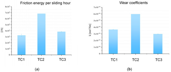 One the one hand, quantitative assessments regarding friction were carried out by calculating the dissipated friction energy. Figure 17a shows the mean dissipated friction energy per test hour for the respective test conditions in a bar chart. In this regard, a linear relationship with the duration of the test could be determined, with all other conditions being equal. This can be read from the bar chart, as the related values for TC 1 and TC 3 are approximately at the same level, and thus a linearity of the friction energy on the total test time is seen. With an increased load, a significant increase (~ doubled) was also seen here in comparison with the reference level, which indicates that the frictional force increased relative to the applied normal load (i.e., similar coefficient of friction), thus showing that the system was sensitive to an extraordinary increase in normal force.