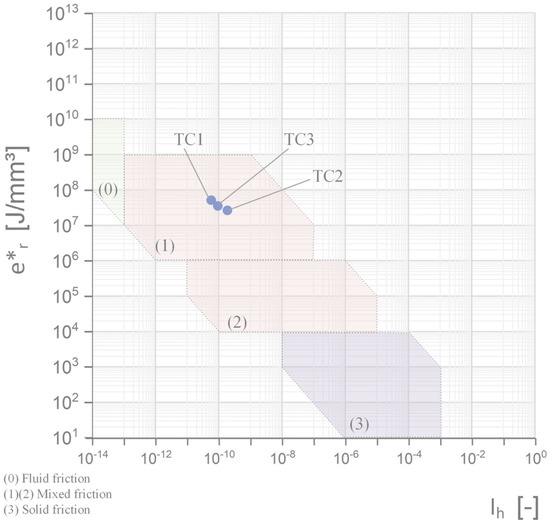 Apparent friction energy density (e*r) plotted over the linear wear intensity (Ih) of the test categories.