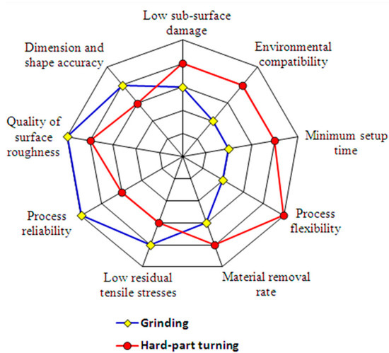 Choudhury and Chinchanikar [1] also showed the qualitative benefits of hard turning over grinding using a radar plot displayed in Figure 2. Apart from benefits, some limitations were also reported by researchers, which have been listed below [2]: