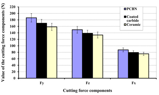 The consequence of turning tool materials on cutting force components when cutting speed = 175 m/min, feed = 0.15 mm and radius of tool = 1.2 mm [30].